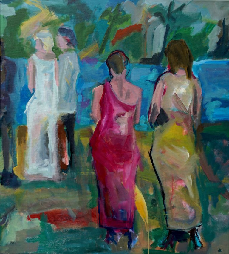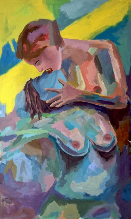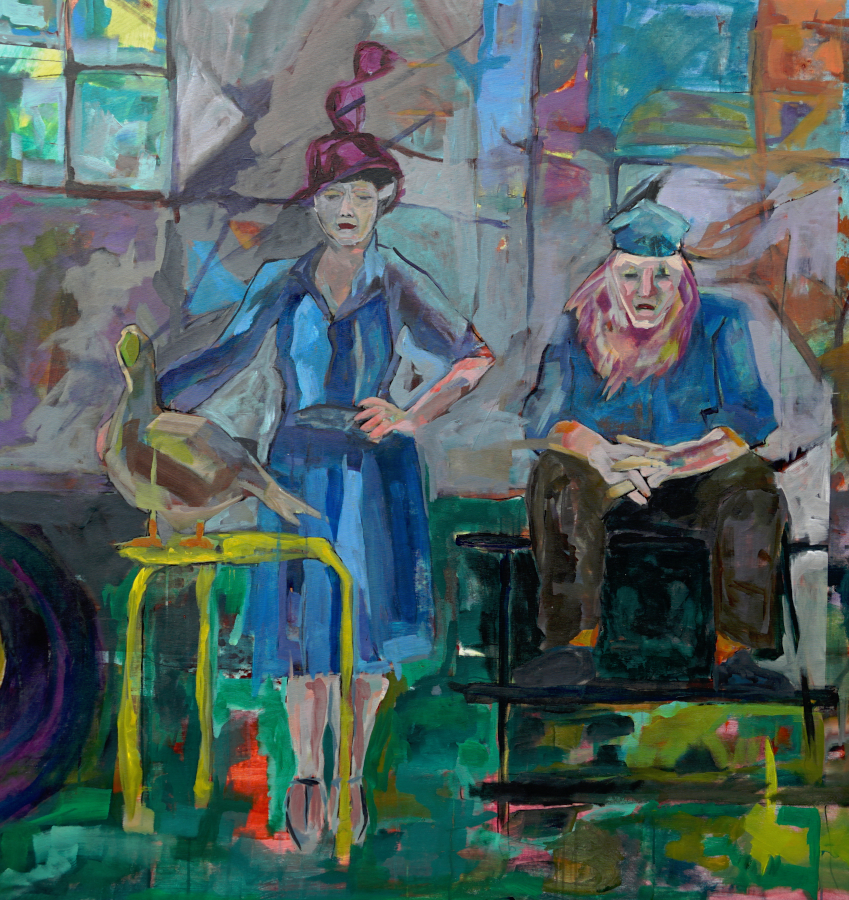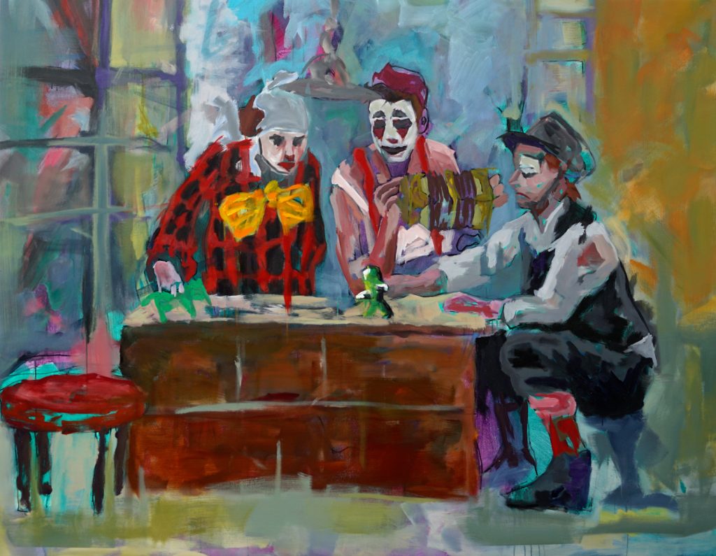 Clows drama - acrylic - 120x160 cm Wedding on corfu - acrylic- 90x100 cm Clown diptychon 1 - acrylic - 85x165 cm Clown diptychon 2 - acrylic - 85x165 cm Kiss - acrylic - 90x120 cm Circus, mother with son - acrylic - 85x165 cm Women with goose - acrylic - 155x165 cm Mother changing clothes -acrylic - 85x165 cm Desire - acrylic - 110x110 cm